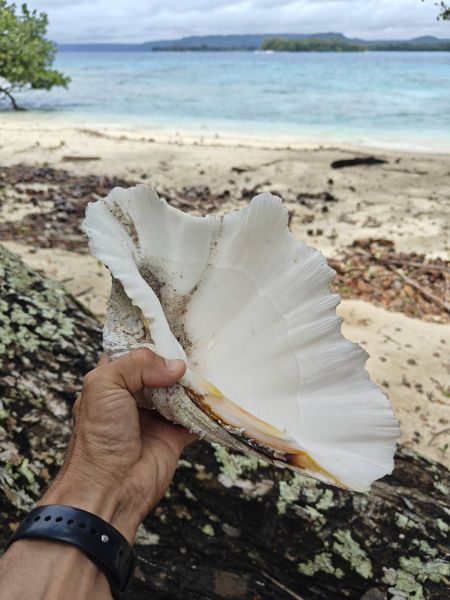 More rain overnight and into the morning slowed things down but around 10am there was a break in the rain which I used to sneak off to the island. With no real plan I took my time, stopping in multiple spots to just stare out into the ocean and watch the plentiful hermit crabs scurry around. I poked around the shoreline for shells but didn’t really find much of interest except on very large giant clam shell, likely dinner for one of the villagers at some point.