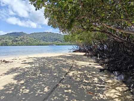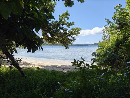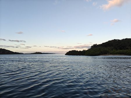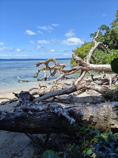 On the hunt, sort of, for the dugongs. Yesterday the villagers pointed to an area where we might find them, but our real reason for the change of anchorage was to have a good launching spot for the following day’s passage. The new spot was just three miles away but involved navigating all of the reefs again. With our track inbound, it was easy to get out. A short motor and we were dropping our anchor. Just about the time I put the bridle on I heard the chain dragging over dead coral. No bueno. Up came the chain and we went to our second-choice spot. We actually had to go a long distance since there were all kinds of reefs to work around. Our new spot was a great sandy bottom.