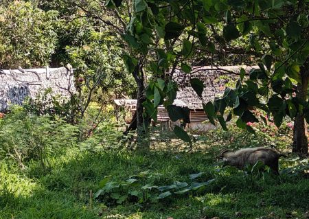Carl and I paddled into shore of a tiny island with our snorkeling gear. I followed a path that snaked along the edge of the island. About half a mile later I came upon a very small village maybe five or six homes. I looked around for a few minutes, didn’t see anyone to ask permission, so I headed back to the paddleboard. Carl was waiting with his paddle in hand. While I was gone a large pig, medium pig, and four piglets came out of the forest and he was ready to whack them should the rush him. No drama ensued.
