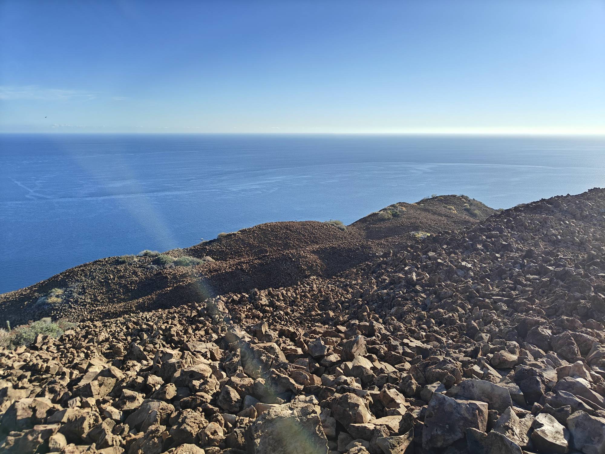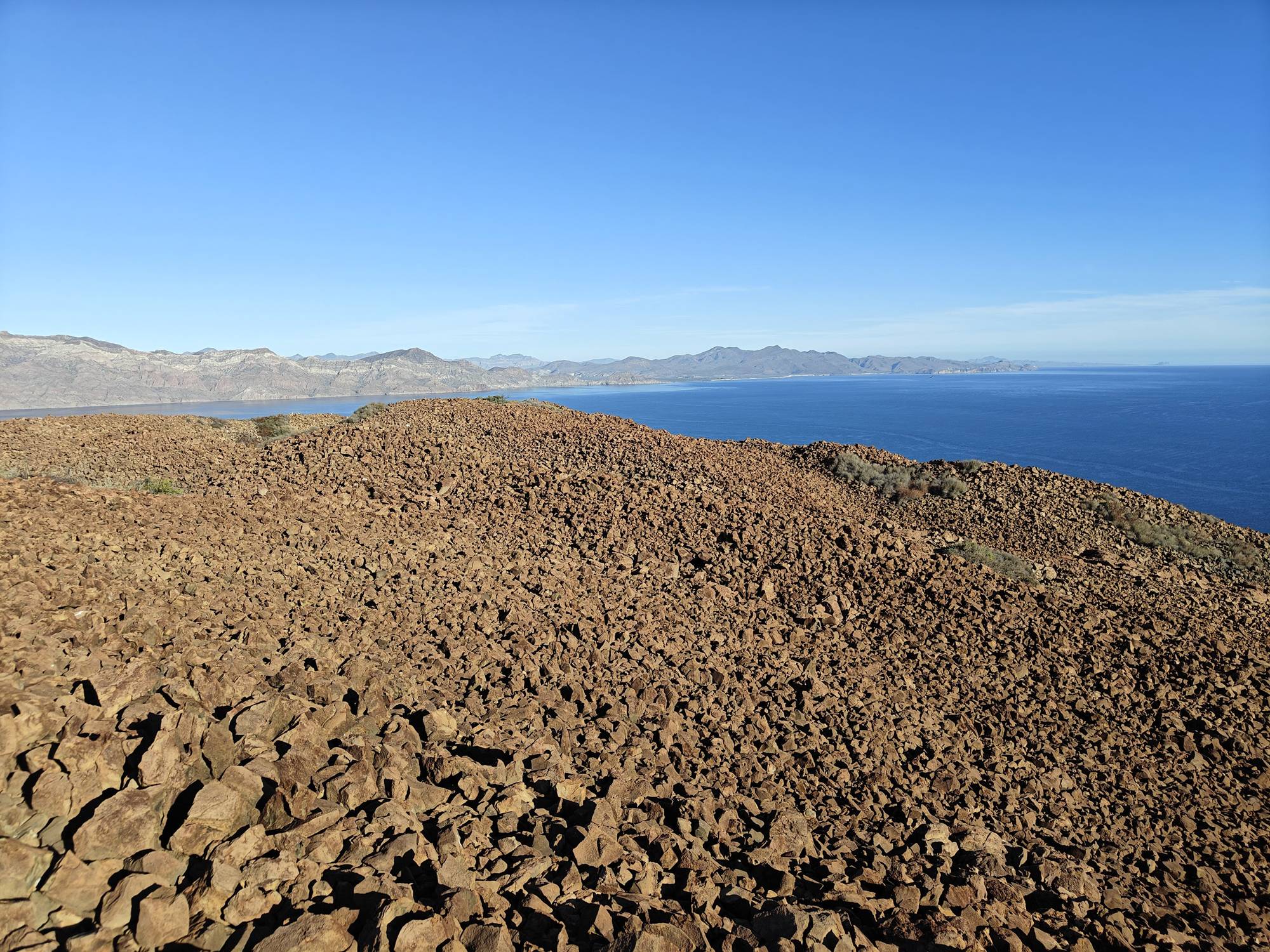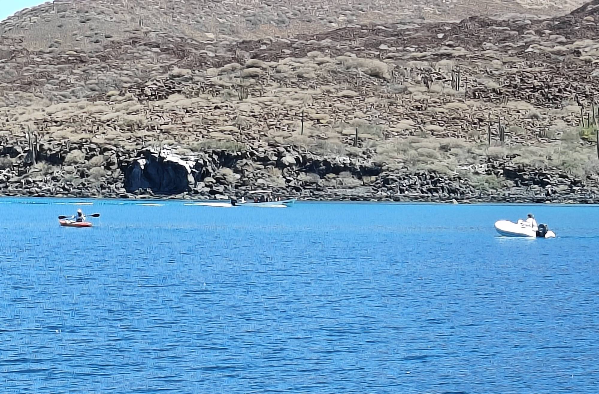 It being a Saturday and the crowds that brings, this was just a one night stopover. But I needed to get the volcano hike in, so just after sunrise I was in the dinghy to shore. I made quick work out of the hike hustling up. Reaching the top I took a few minutes for a rest and a snack before restlessness came over me and I decided to circle the caldron for the first time. The various peaks on the north side all required working out my ankles on the loose, sharp, irregular shaped rocks. Thankfully no rattlesnakes were seen and some new views were enjoyed.