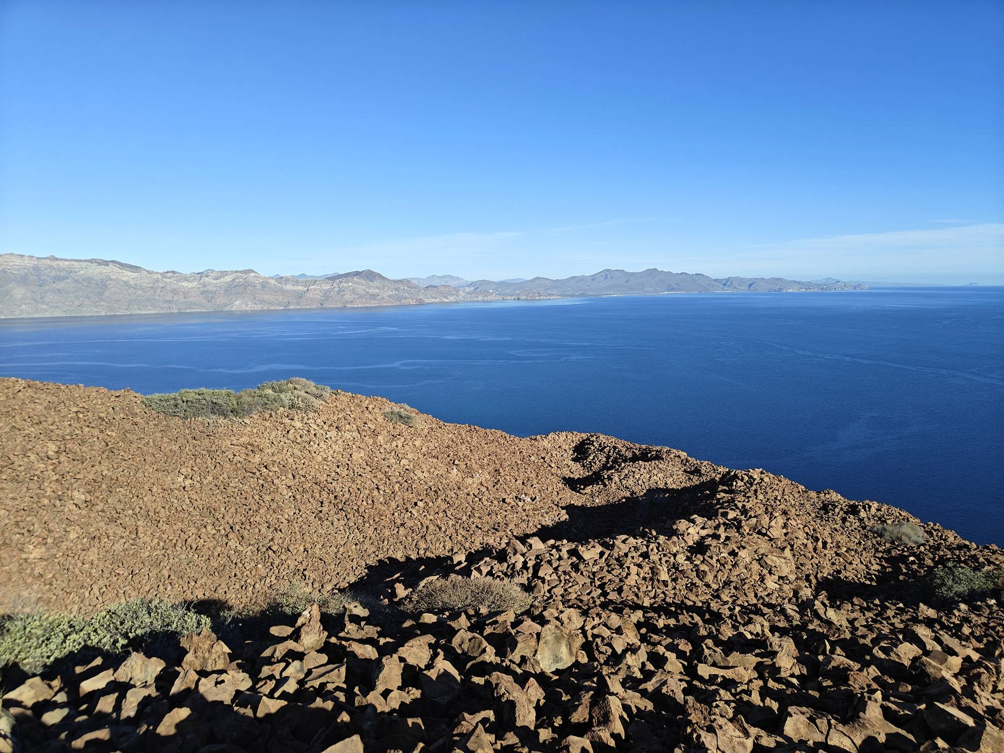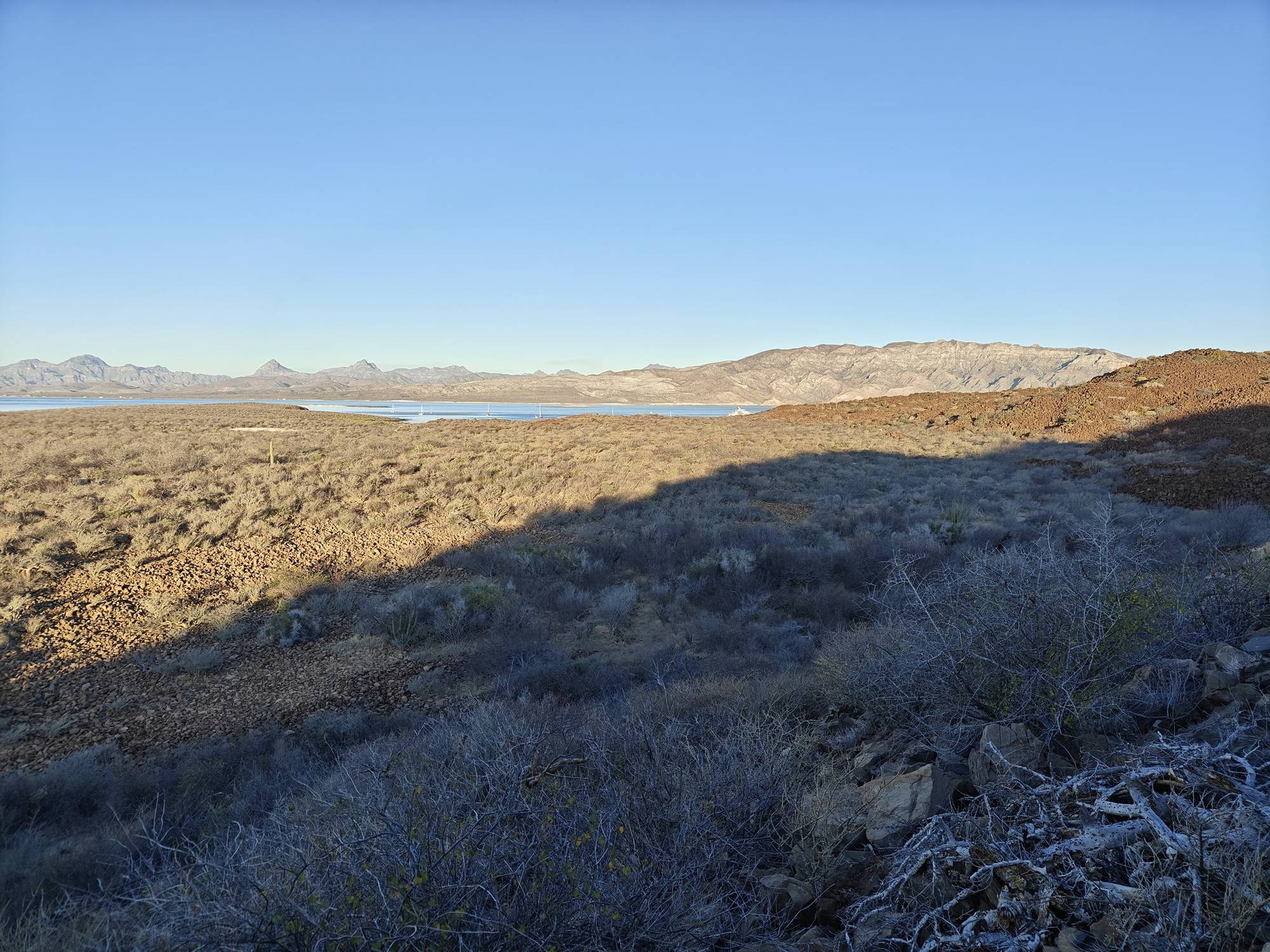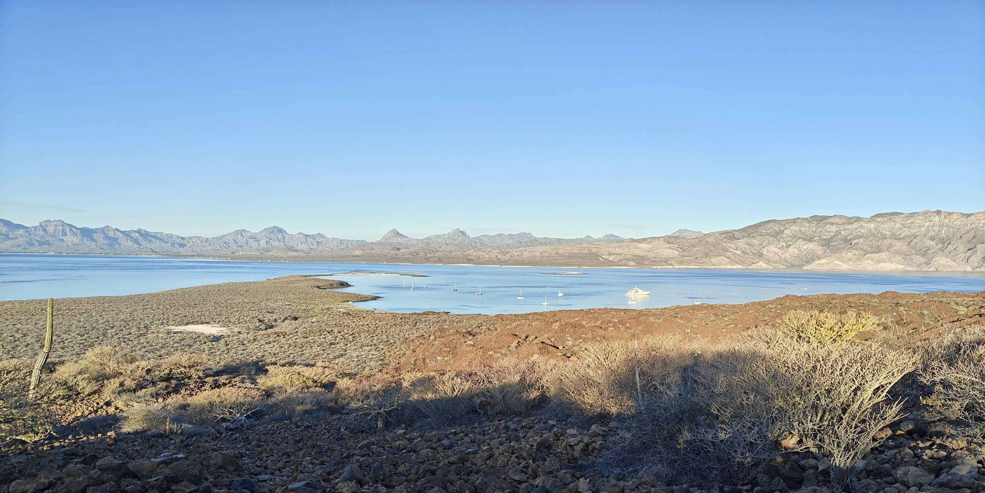 It being a Saturday and the crowds that brings, this was just a one night stopover. But I needed to get the volcano hike in, so just after sunrise I was in the dinghy to shore. I made quick work out of the hike hustling up. Reaching the top I took a few minutes for a rest and a snack before restlessness came over me and I decided to circle the caldron for the first time. The various peaks on the north side all required working out my ankles on the loose, sharp, irregular shaped rocks. Thankfully no rattlesnakes were seen and some new views were enjoyed.