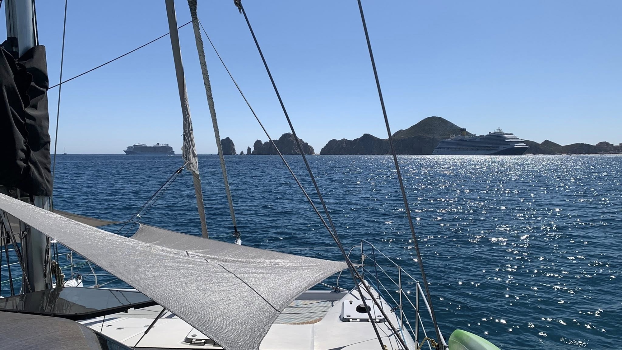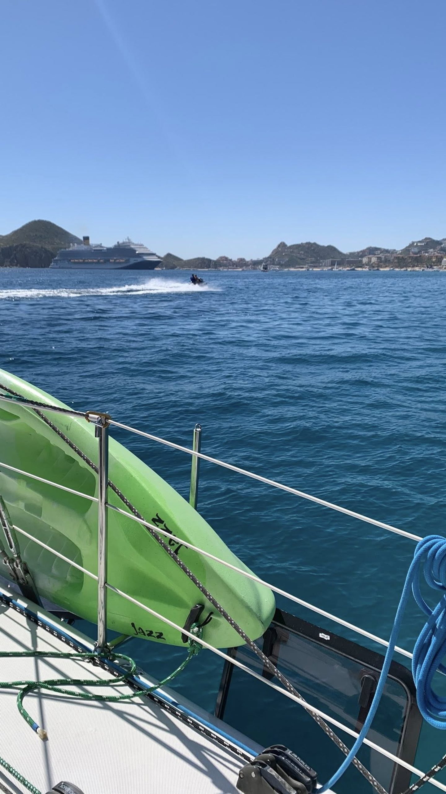 First, I am not a fan of Cabo. Too loud. Too many jetskis. Too rolly. But it is a great place rest up, provision, get fuel, and wait for a weather window to enter the Sea of Cortez. We checked all of those boxes, starting with lunch followed by getting fuel. Fuel transferred into the main tanks, Jack and I headed back for one more load to fill the jerry cans. All smooth until we get back to the boat and see Vicki with a fender and talking to two jetskiers. Evidently they hit the boat, or drifted into it, hard to know. It was a mother-daughter and the mom had no clue how to run a jetski. I looked at the damage from the dinghy and while she was pointing out the spot on the side just about banged in again. The damage was minor so I hollered for them to just get away from the boat. Turned out to only be black rubber from the jetski stuck on two spots and I was able to get it cleaned off. Fuck this place and the jetskis.